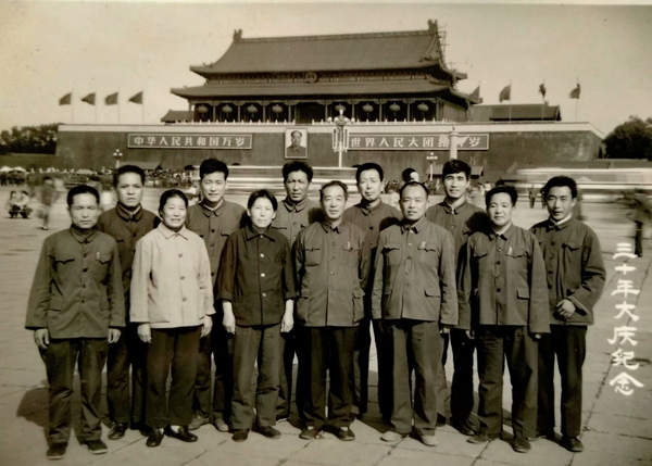 先说图一,这是我父亲高焕良(前排右一)。1979年10月1日与一起在北京全国总工会干校培训的“山东组的全体学员”在天安门前的合影,照片右侧清晰地写着“三十年大庆纪念”的字样。父亲是个老煤炭,当时担任山东省莱芜矿务局工会主席,在全总参加培训的“山东组”的成员都是山东省各地市、大企业的工会主席。一晃40年过去了,我父亲已于2000年5月去世,为了搞清楚这张老照片的背景,我从父亲的遗物——一摞笔记本中寻找线索,父亲有写日记的习惯,他去世后,他的那些日记本都在我的书橱里存着。经过一页一页的浏览,终于找到了父亲在那天写下的日记,父亲在日记中写道:“1979年10月1日(星期一)有小雨,今天是中华人民共和国建国三十周年,为了欢度国庆,我们山东组的全体同志游览了故宫、北海公园、中山公园、前门大街,首都到处人山人海,一片繁荣景象。更有意义的是,我们全组同志还高兴地在天安门前合影留念。晚上,我们在干校看了电视。这样的生活,我一生还是第一次,心情特别高兴。”