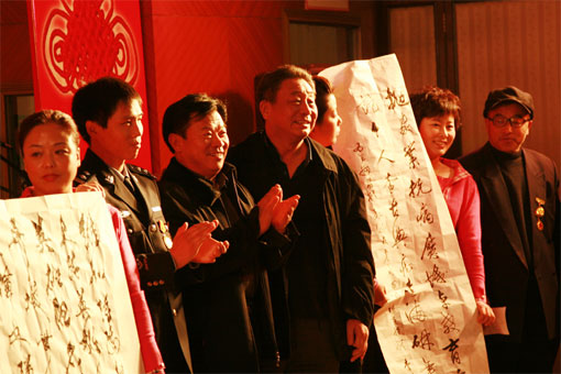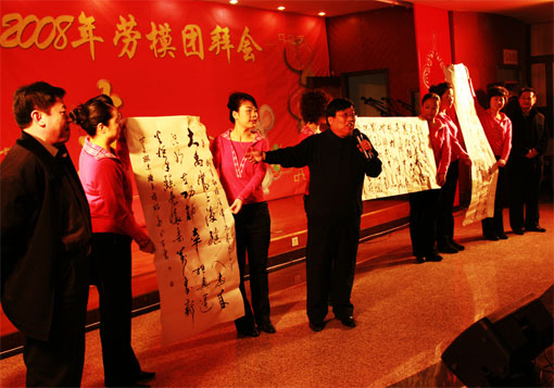 怀柔区书法家协会主席高希祥、副主席叶永生、李祥魁为劳模展示现场书写的作品。