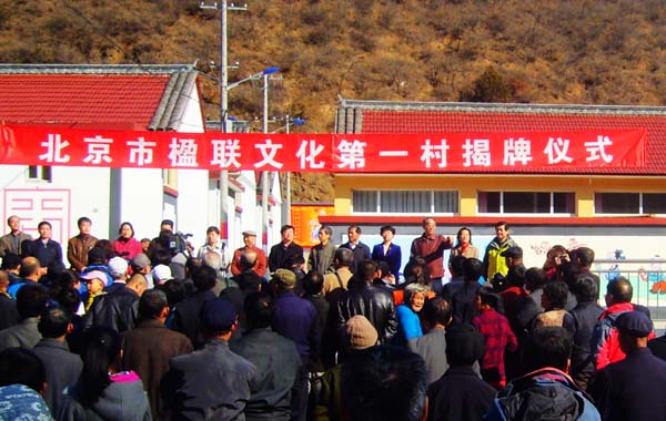 一排排干净整齐的民居,一幅幅喜庆吉祥的楹联,让新地这个怀柔深山沟里的新农村更加光彩照人。10月26日,京郊首个楹联文化村揭牌仪式在这里举行,怀柔区委书记齐静、北京市楹联学会副会长赵永生为楹联文化村揭牌。